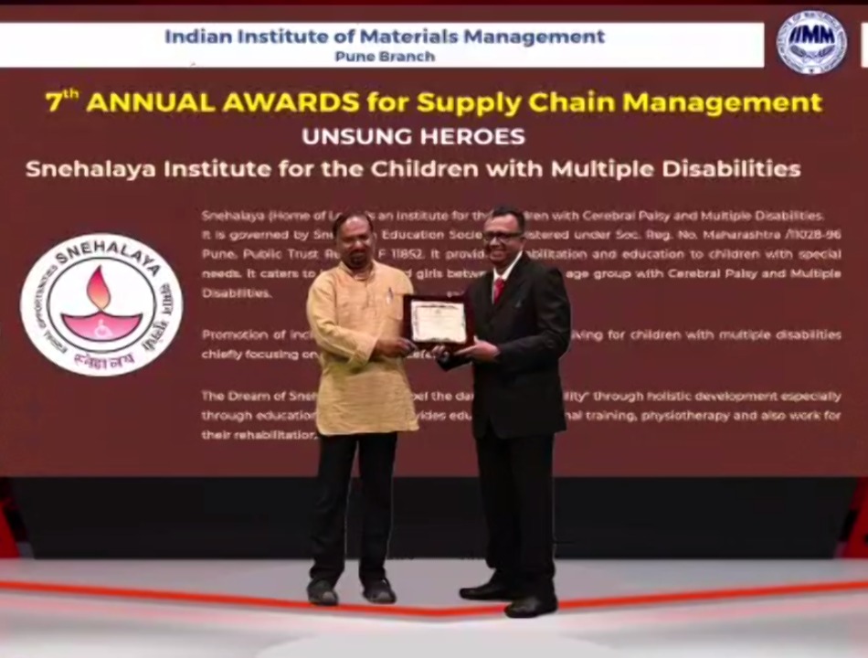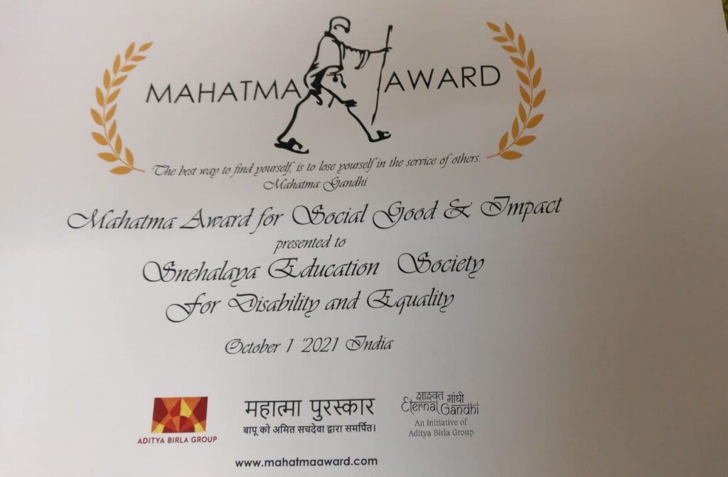 Der Preis wurde Snehalaya im Rahmen der sozialen Wohlfahrt für die Arbeit verliehen, die es seit 25 Jahren für Menschen mit Behinderungen leistet.